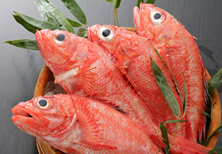 以前この連載で書いたノドグロすなわちアカムツが赤くて風味の良い西の横綱であるならば、東の横綱は明らかに今回のキンキなのだ。その体色、ノドグロがピンクなのに対し、キンキには鮮やかな赤の下に純白の白身と脂がうかがわれ、透かし絵のような美しさがある。目玉パッチリ黒目ハッキリ、別名〝メンメ〟と呼ばれるのがいや応なく伝わる。風貌を見れば顔にはごつごつ棘(とげ)があり、明らかにおまえはカサゴの親戚だろという雰囲気だ。