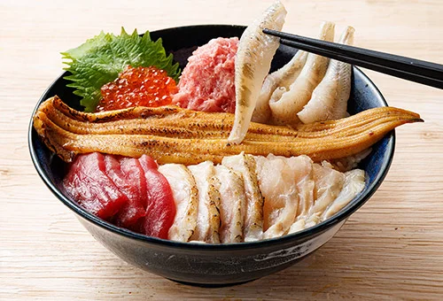 発見!ふくしまお魚まつりの人気ブース「なこそ処 ちょんまげ」では、海鮮丼のネタが充実!福島自慢の魚介をてんこ盛りにした「ノドグロ炙りとメヒカリ刺し入りふくしま全部のせ丼」には、ほとんど地元でしか出回らないメヒカリ刺しと、いわき・小名浜漁港に水揚げされた本マグロの幼魚のメジマグロ刺しの新ネタに、“白身のトロ”と呼ばれるノドグロの炙り、「常磐もの」の代表格のヒラメの漬け、脂ののった焼きアナゴ、福島県立小名浜海星高等学校の生徒が練習船「福島丸」で漁獲したマグロのネギトロに、彩りのイクラを添え、全7種類の豪華さです。メヒカリは、唐揚げや干物が定番ですが、地元では刺し身や寿司ネタとしても食されており、水揚げされたばかりの新鮮なメヒカリを一尾ずつ丁寧に切り身にし、急速冷凍して真空パックし新鮮な状態で提供。メジマグロはほどよい脂がのり、すっきりとした味わいが特徴です。ノドグロ炙りとヒラメ漬けに、コリコリとしたヒラメのえんがわを添えた「ノドグロ炙りとヒラメ漬けとえんがわ丼」と、メジマグロ刺しと漬け、ネギトロを盛った「常磐マグロ刺し&漬けと福島丸ネギトロ丼」のリニューアルメニューも登場します。
