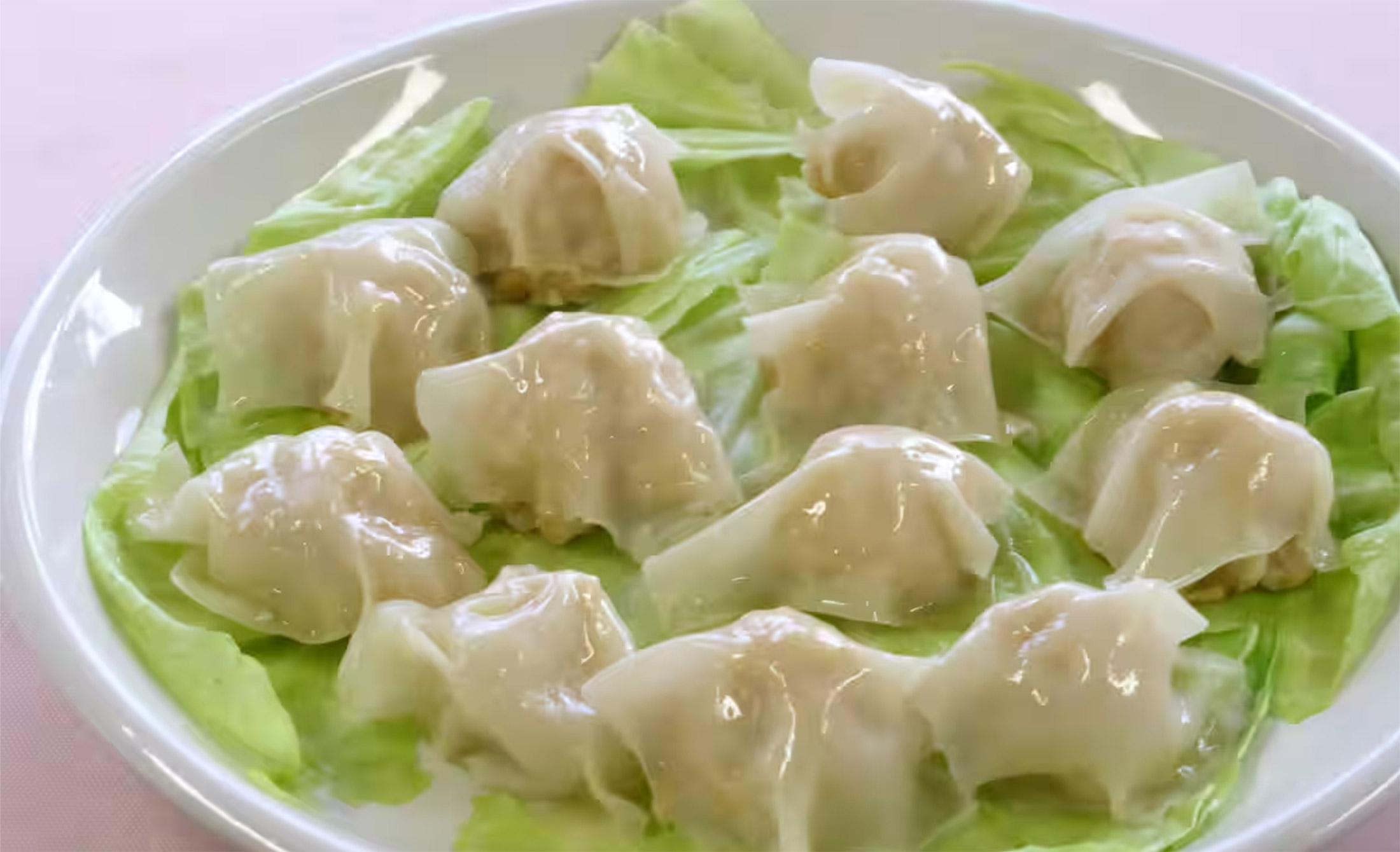 シューマイの皮を水にくぐらせて両面ぬらし、タネの上にのせて、両手で包み込むようにします。ふんわりと軽くラップをかけて電子レンジへ。加熱後いったん取り出し、皮に水分を足します。霧吹きやはけを使ったり、スプーンで少量の水をかけたりしても。さらに加熱して、ほかほかのシューマイが完成しました。
