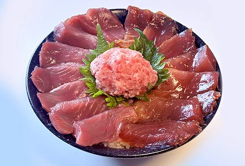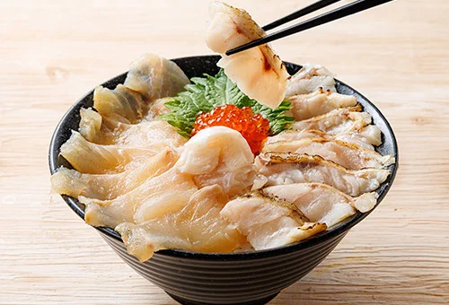 発見!ふくしまお魚まつりの人気ブース「なこそ処 ちょんまげ」では、海鮮丼のネタが充実!福島自慢の魚介をてんこ盛りにした「ノドグロ炙りとメヒカリ刺し入りふくしま全部のせ丼」には、ほとんど地元でしか出回らないメヒカリ刺しと、いわき・小名浜漁港に水揚げされた本マグロの幼魚のメジマグロ刺しの新ネタに、“白身のトロ”と呼ばれるノドグロの炙り、「常磐もの」の代表格のヒラメの漬け、脂ののった焼きアナゴ、福島県立小名浜海星高等学校の生徒が練習船「福島丸」で漁獲したマグロのネギトロに、彩りのイクラを添え、全7種類の豪華さです。メヒカリは、唐揚げや干物が定番ですが、地元では刺し身や寿司ネタとしても食されており、水揚げされたばかりの新鮮なメヒカリを一尾ずつ丁寧に切り身にし、急速冷凍して真空パックし新鮮な状態で提供。メジマグロはほどよい脂がのり、すっきりとした味わいが特徴です。ノドグロ炙りとヒラメ漬けに、コリコリとしたヒラメのえんがわを添えた「ノドグロ炙りとヒラメ漬けとえんがわ丼」と、メジマグロ刺しと漬け、ネギトロを盛った「常磐マグロ刺し&漬けと福島丸ネギトロ丼」のリニューアルメニューも登場します。