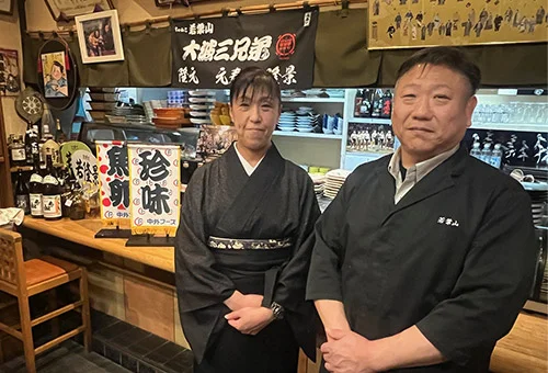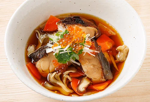 中外フーズが、若元春・若隆景の兄弟の取組に懸賞を懸けて応援している“縁”から、若葉山とのコラボが実現しました。今は脂ののりがよく高級魚となっている銀だらですが、かつては値段が手ごろで、大波店主によると、相撲部屋のちゃんこ鍋によく使われていたそう。そんな「昭和の力士たちの大好物」を大波店主が蘇らせました。タレに漬け込み、焼いた銀だらの大振りの切り身を器に盛り、きのこと野菜たっぷりのしょうゆ出汁をかけ、ネギ、三つ葉、水菜にイクラものせていただきます。「ホロホロの身を崩しながら食べると、極上の脂が出汁に溶け出し、最高の味わい」(大波店主)となります!