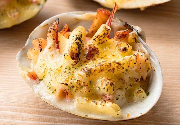 ホッキ貝の磯の風味と濃厚なホワイトソースが絶妙にマッチ。こぶしほどの大きな貝殻に盛りました。