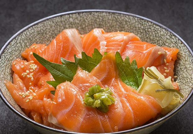 阿武隈川の清流で丹精込めて育てられた「メイプルサーモン」と、白身の女王ヒラメを鮮やかな丼に。福島の海と山の恵みを感じてください。