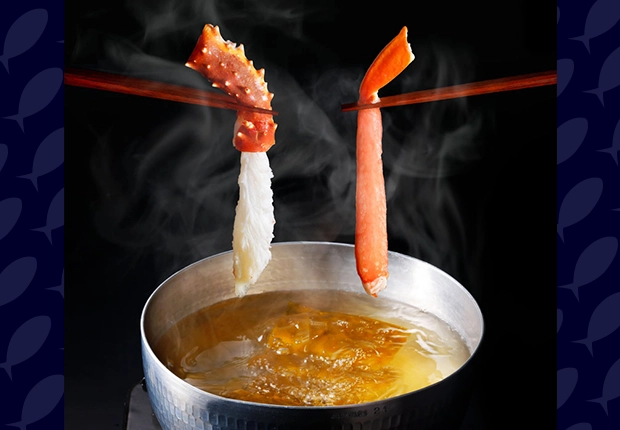 お刺身でも食べられるほど新鮮なたらばがにとずわいがにをしゃぶしゃぶでご提供いたします。だしとなるスープも昆布をベースにしたこだわりの逸品です。ぜひご堪能下さい。