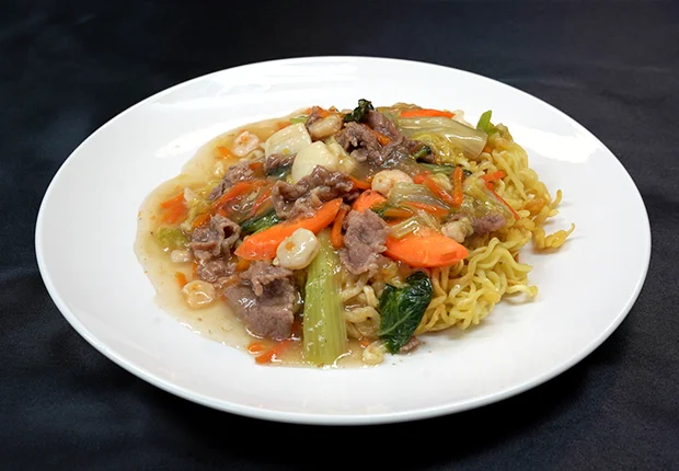 定番の海鮮あんかけ焼きそばに、選び抜いた上質な和牛を贅沢に使用。A5和牛の中でも特に柔らかくおいしい部位を使用しており、まさに肉の芸術品!海の幸と陸の王のファビュラスでインコンパラブルなエンカウンターをお楽しみください。