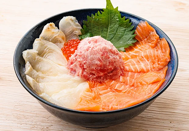 北海道直送の新鮮な海の幸を豪快に盛り付けた、食べ応え抜群の海鮮丼です。マグロ、サーモン、イクラが“めちゃめちゃ”とこぼれ落ちる一杯を堪能しよう!