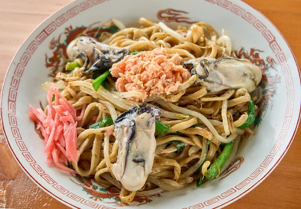 宮城のブランド養殖ギンザケ「みやぎサーモン」を柔らかく焼き上げ、ソースには宮城県南三陸町のブランド牡蠣「戸倉っこかき」を100%使用。神田の人気ラーメン店「五ノ神水産」監修のイベント限定の焼きそばです。
