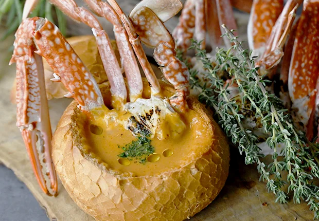 サクふわのパンの器に注がれるのは、魚介の旨みがあふれるクラムチャウダー、香り高いポルチーニのクリームスープ、そして濃厚なワタリガニのビスク。寒い外でも、ひと口で体の芯まであたたまる。