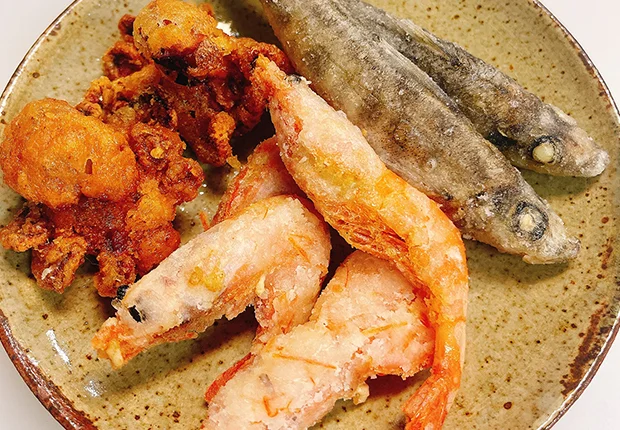 メヒカリ・甘エビ・イイダコのから揚げ3種を盛り合わせた三JYU士プレート!どれも美味しくて選べないから全部まとめた欲張りな一皿です!