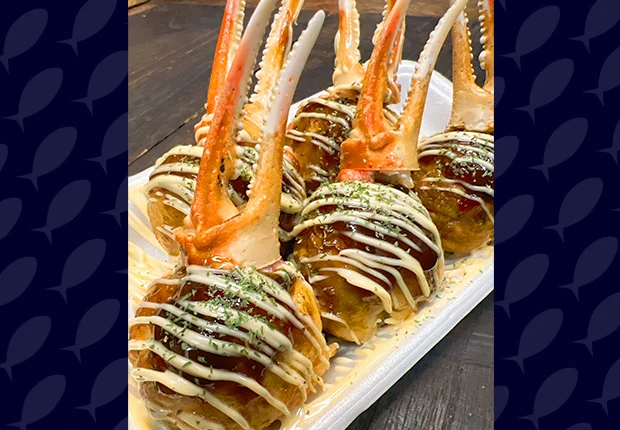 ひときわ目を引くカニの爪が突き出た「カニ爪のボール焼き」。見た目のインパクトはもちろん、味も本格派。海の幸と屋台グルメの新しい出会いをお届けします。写真を撮らずにはいられない、フェス限定の一品です!